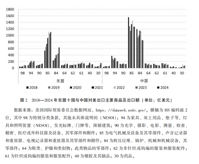 此外,东盟对中国的出口也呈现出稳步增长态势,且出口结构中中间品与功能性部件所占比重不断提升。以越南为例,2024年其对中国出口额达986.78亿美元,较2018年增长54%以上;马来西亚则从632.05亿美元增至1105.50亿美元,反映出双边贸易中电子类与高技术产品比重持续上升。泰国、新加坡等国对华出口亦表现出结构性协同增强趋势。进一步观察HS编码重合性可发现,2024年东盟对美出口前十大商品类别中,有九项同时出现在中国对美出口的前二十位品类中,包括电气设备(HS85)、机械设备(HS84)和精密仪器(HS90)等关键行业。这种产品结构的高重合度表明,东盟并非在中国产品“退出”基础上进行替代式进入,而是在中国中间品持续溢出的基础上,实现了区域分工协同与功能性嵌套参与(Vertically Integrated GVC Participation)。