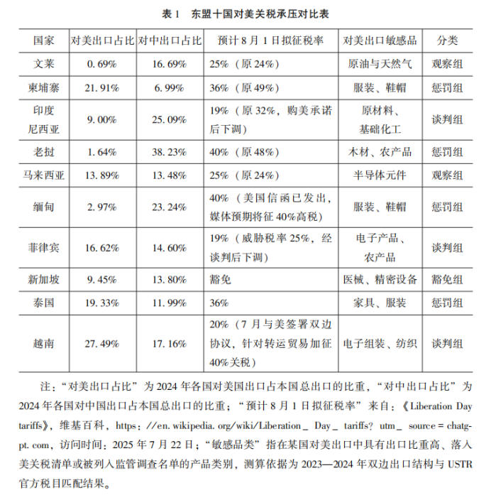 第二,承压者角色。美方差别关税政策的次级承压区。东盟成为美国关税政策差别施压的主要目标区域之一。表1具体呈现了东盟十国面临美方关税施压的差异化状况。其中,柬埔寨、泰国、老挝与缅甸四国对美出口依赖度高、出口产品集中于敏感品类(如服装、木材等),且在原产地监管、制度透明度等方面存在短板,被列为高风险“惩罚组”,拟征税率超过36%。文莱和马来西亚虽然在敏感产业上有所涉足,但具备与美谈判潜力,暂未触发系统性信任危机,拟税率集中为25%。印度尼西亚、菲律宾和越南三国通过双边对话与采购承诺换取税率下调;例如越南在与美方签署协议后,其电子与纺织品类税率由原计划的40%降至20%;印尼则在承诺扩大对美商品采购后,税率自32%下调至19%。而新加坡因制度环境和技术能力突出,被列为“豁免组”。这种差别化施压策略显示,美国正试图将贸易治理压力制度化并转嫁至区域层面。