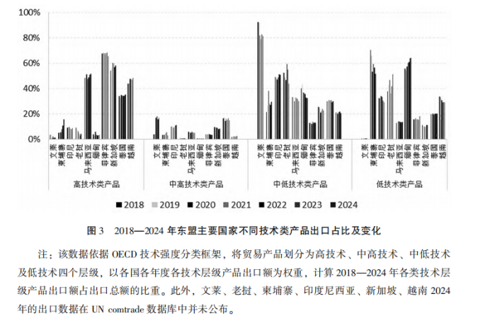 从技术密集度来看,东盟整体的出口结构逐渐从劳动密集型产品向资本和技术密集型产品升级。依据OECD技术强度分类框架及ISICRev.4—HS2017映射标准,对2018年至2024年东盟国家出口产品的分析表明(见图3),产品出口结构变化具有异质性。