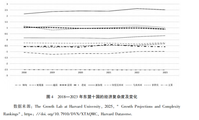 如图4所示,2018年至2023年间东盟国家ECI值分化趋势显著。新加坡始终位居东盟首位(2023年达2.52),体现其在高技术产品制造与服务嵌套方面具备高度复杂性与结构稳定性。马来西亚、泰国、菲律宾和越南处于中等复杂度水平,其中越南ECI稳步上升,从2018年的0.16增至2023年的0.35,显示其产业多样性和附加值能力正在提升。菲律宾和泰国则出现一定波动,表明其制造升级仍受内外部约束。相比之下,印度尼西亚、老挝、缅甸、柬埔寨与文莱的ECI值整体偏低,2023年分别为-0.24、-0.58、-0.98、-0.33和-2.5,反映出其出口结构依然集中于初级产品或低端加工,缺乏技术扩散与产业延展能力。总之,东盟国家对外贸易结构正在由低附加值品类向高附加值领域拓展,但国家间升级路径显著分化。部分国家(如新加坡、马来西亚)已基本实现向“创新导向”转型,另一些国家仍处于“成本比较优势”主导的阶段。在全球供应链持续重组背景下,出口结构与产业功能的协同演进,将成为决定东盟各国未来价值链地位与增长韧性的关键因素。