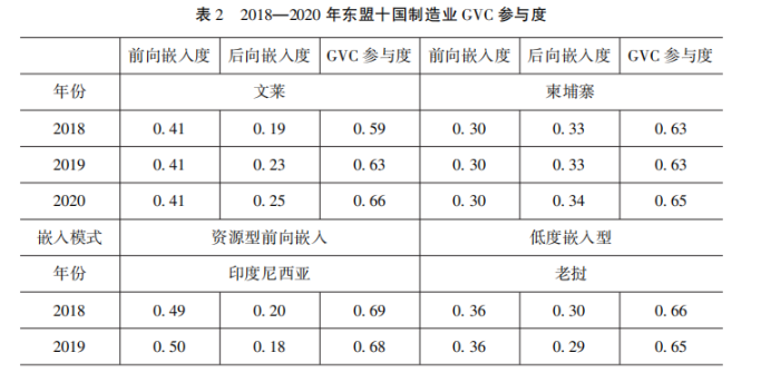 除经济复杂度外,出口结构的升级更深层地体现在全球价值链(GVC)中的嵌入模式变化。具体而言,不同国家在GVC中的参与层级决定了其附加值获取能力与抗风险能力。为精确量化各国的全球价值链参与情况,本文参考Koop-man等(2010)提出的GVC参与指数计算方法,得到东盟国家制造业的前向嵌入度、后向嵌入度和GVC参与度。GVC参与指数从整体上衡量了一国某产业参与全球价值链的深度和分工地位,前向嵌入度越大表明一国某产业处于国际分工地位越高,在技术或资源上具有上游优势;后向嵌入度越高表明该国该产业越依赖进口中间品,以加工组装为主。因数据可得性,本文测算了2018年至2020年东盟各国制造业的GVC参与度,详见表2。数据来源于OECD的TIVA数据库,其中制造业行业的选取参考王庆年等(2023)学者的研究,在TIVA的45个行业中选取17个制造行业。