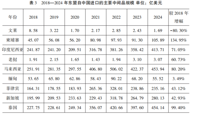 从国别结构来看,近年来东盟主要经济体自中国进口中间品的规模显著增长,呈现出产业耦合加深、功能分工明晰的趋势。2024年,越南自中国进口的中间品总额达到1088.30亿美元,较2018年的539.66亿美元增长超过102%,表明其制造业扩张与对美出口增长过程中,中国中间品在关键工序上的功能性嵌入不断深化。特别是在电子组装与机电产品等高附加值行业,中国提供的电路板、显示模组、电机元件等核心部件已成为越南出口成品的重要技术基础。马来西亚表现出类似趋势。2024年从中国进口中间品总额为453.94亿美元,其中硅晶片、封装材料和自动化设备等构成其半导体产业链上游的关键投入,占比超过60%。已有研究指出,马来西亚对美出口终端产品中,约三分之二可溯源至中国产零部件,说明中马在高技术制造业中已建立起稳定的垂直分工路径(Zhang & Li,2025)。菲律宾和印度尼西亚亦显示出中间品进口的持续扩张。2024年,菲律宾中间品进口额达235.16亿美元,较2018年增长43.12%;印度尼西亚同期从241.87亿美元增至413.71亿美元,增长71.05%。二者在电子组件、机械设备等领域的加工与装配能力提升显著,而这一过程显然建立在对中国高技术中间品持续获取的基础上,体现出区域内功能互补型产业协作的深化。柬埔寨虽仍以轻工制品出口为主,但其中间品进口年均增长超过15%,2024年总额达105.89亿美元,较2018年增长134.95%。这表明其正由传统劳动密集型加工模式,逐步向组装导向的制造业过渡,体现出价值链上移的初步特征。新加坡则作为东南亚高附加值制造与服务枢纽,2024年从中国进口中间品280.13亿美元,主要集中于ICT设备、医疗器械与精密零部件,展示出其在区域价值链中的技术节点地位。