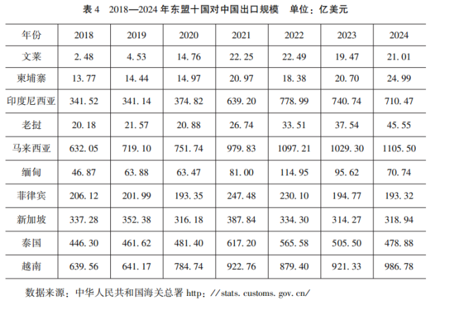 综上可见,现有研究从多维角度揭示了中美战略竞争背景下东盟贸易结构的变动路径,为理解大国博弈对区域经济体影响提供了重要参考。然而,随着大国博弈日趋复杂,贸易替代的可持续性与产业链本地化嵌入等问题逐渐凸显,东盟国家面临的结构调整任务也更加多样。特别是在中间品环节的动态演化、东盟内部结构差异与应对策略等方面,仍有深化空间。基于此,本文在吸收既有成果的基础上,聚焦中美关税博弈下2018年至2024年东盟国家贸易规模及结构变化,研究东盟国家在全球价值链位置的演变趋势及其产业升级路径,呈现东盟在大国竞争格局下角色调整,为区域经济体应对复杂外部环境提供理论依据和实践指导。