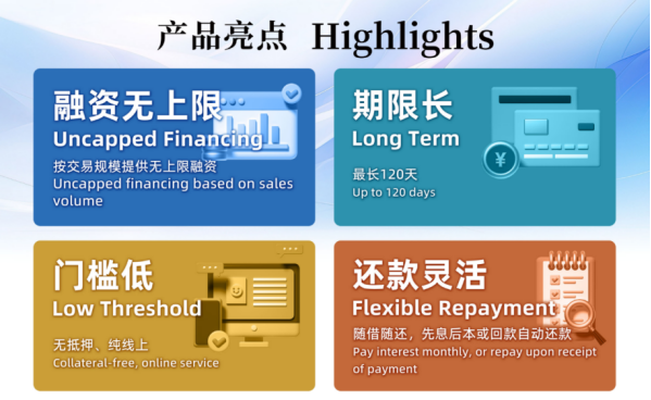 天逸集团旗下电商业务聚焦全球跨境电商平台卖家的融资需求,推出电商融资专属服务平台——天逸电商宝。依托全球跨境电商平台背书,天逸电商宝可为沃尔玛等各大平台的优质电商卖家提供上不封顶、无抵押、最长120天的电商融资服务,同时支持包括人民币(CNY)、美元(USD)、欧元(EUR)等多种主流币种融资,满足卖家销售旺季扩大生产的资金需求,同时灵活的还款方式,助力中国卖家轻装上阵、决胜全球。