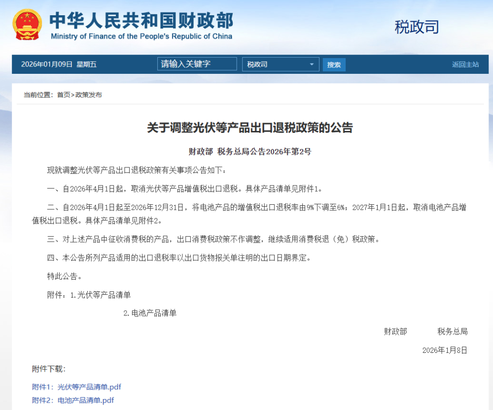 关于调整光伏等产品出口退税政策的公告 财政部 税务总局公告2026年第2号 现就调整光伏等产品出口退税政策有关事项公告如下: 一、自2026年4月1日起,取消光伏等产品增值税出口退税。具体产品清单见附件1。 二、自2026年4月1日起至2026年12月31日,将电池产品的增值税出口退税率由9%下调至6%;2027年1月1日起,取消电池产品增值税出口退税。具体产品清单见附件2。 三、对上述产品中征收消费税的产品,出口消费税政策不作调整,继续适用消费税退(免)税政策。 四、本公告所列产品适用的出口退税率以出口货物报关单注明的出口日期界定。 特此公告。 附件:1.光伏等产品清单 2.电池产品清单 财政部 税务总局 2026年1月8日 网站截图
