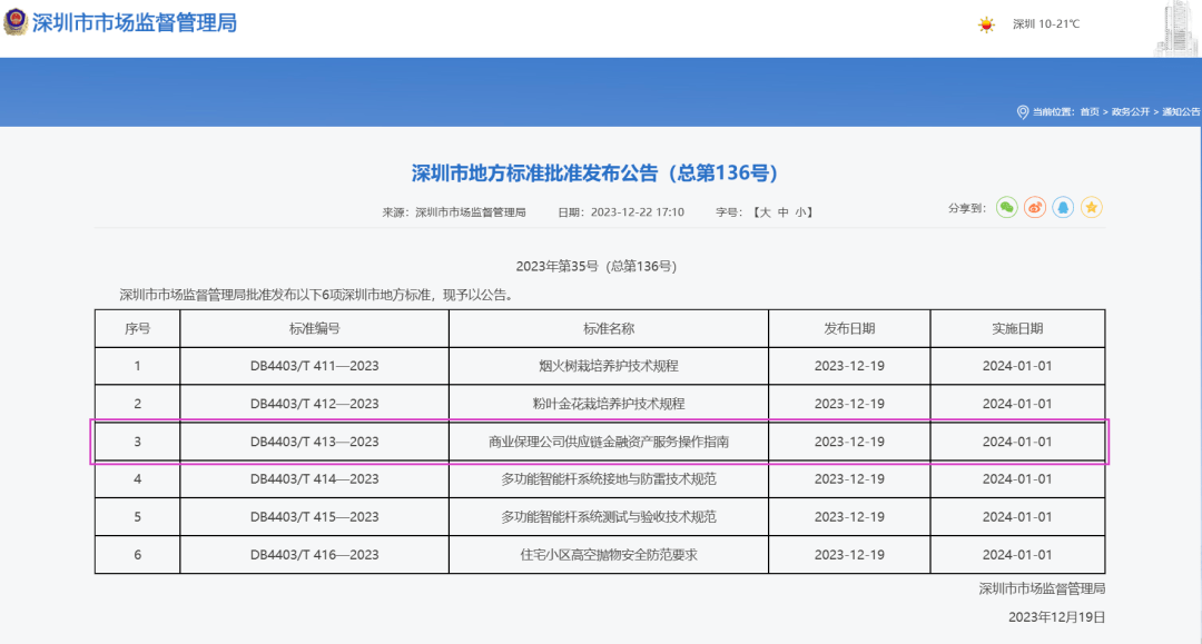 12月22日,深圳市市场监督管理局批准发布地方标准《商业保理公司供应链金融资产服务操作指南》(以下简称《指南》),提供了商业保理公司开展供应链金融资产服务的全周期业务流程操作、智能化科技应用和服务可视化的指引,并适用于商业保理公司开展基于核心企业类型的供应链金融资产服务。值得一提的是,该《指南》由深圳市商业保理协会牵头、前海一方等相关负责人主笔的全国首个针对商业保理的地方标准。