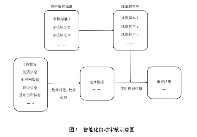 保理业务系统平台可通过将资产审核标准抽象为规则脚本并建立规则脚本库,基于数据对接和数据处理获取的运算数据,使用规则引擎,实现系统自动审核并输出审核结果。智能化自动审核的流程示意图见图1。