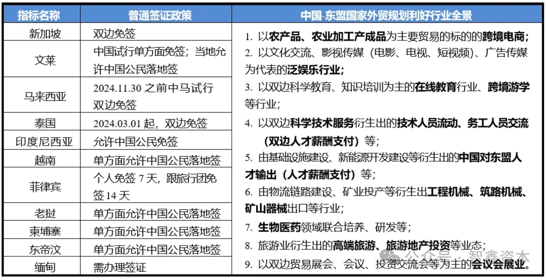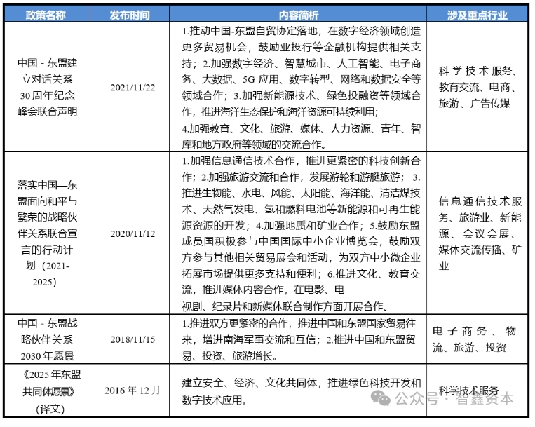 鉴于中国与东盟国家的这些政策走向,预计2024年中国与东南亚各国的双边交流将更为紧密。特别是随着双边免签政策的实施,未来1至3年内,预期中国与东南亚之间在泛娱乐、跨境电商、跨境教育、跨境旅游以及科技人才流动等领域将会经历显著的资金流动需求增长。下图为中国-东盟交流重点政策文件及关键内容简析: