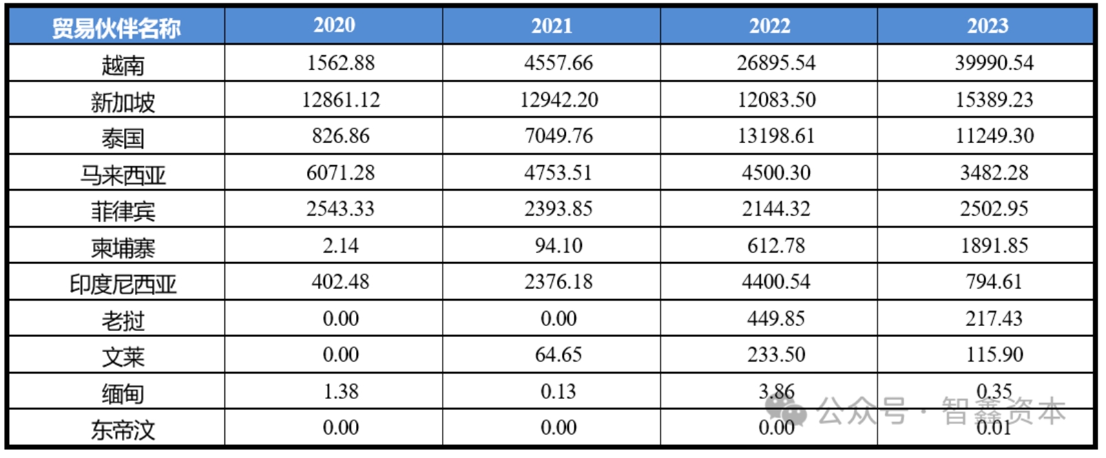 依据海关总署发布的统计数据,自2020年中国为出口货物贸易开辟了跨境电商B2B简化申报商品的统计专栏以来,中国与东盟国家之间的跨境商品交易额呈逐年增长之势。特别是对越南的出口商品金额最为显著,于2023年达到了4亿美元;其次是新加坡,2023年的贸易规模高达1.54亿美元。下图为2020-2023 年中国与东南亚各国跨境电商 B2B 简化申报商品交易规模(单位:亿美元):