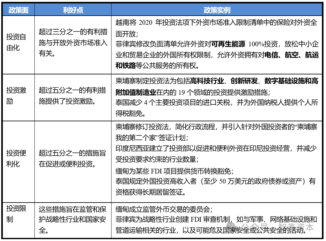 从对内投资政策的角度看,2013至2022年间,东盟成员国共实施了149项影响投资的措施,其中111项是有利于投资者的,27项是中立的,而仅有11项是限制性的。值得注意的是,超过90%的措施对投资者而言是有利的或中性的,这一比例显著高于全球平均水平的68%和亚洲平均水平的86%。在推动国内产业发展方面,东南亚的主要国家都推出了相应的利好政策,进一步展现了该地区吸引投资的潜力。下图为东盟投资利好政策分析: