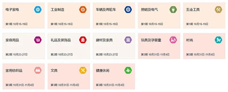 第一期时间:10月15-19日(电子家电、工业制造、车辆及两轮车、照明及电气、五金工具)