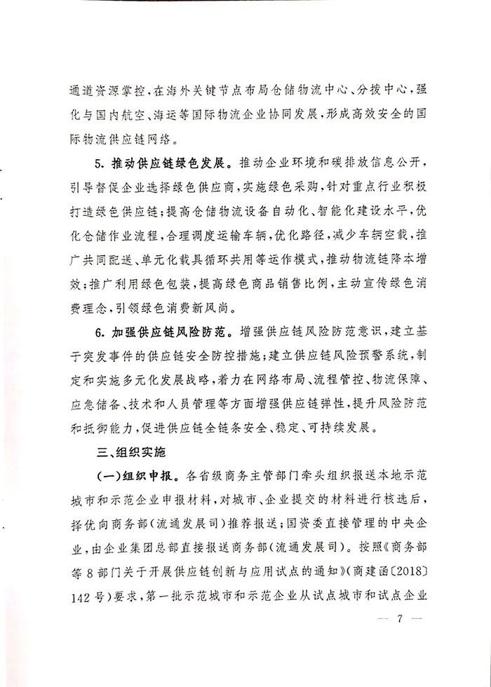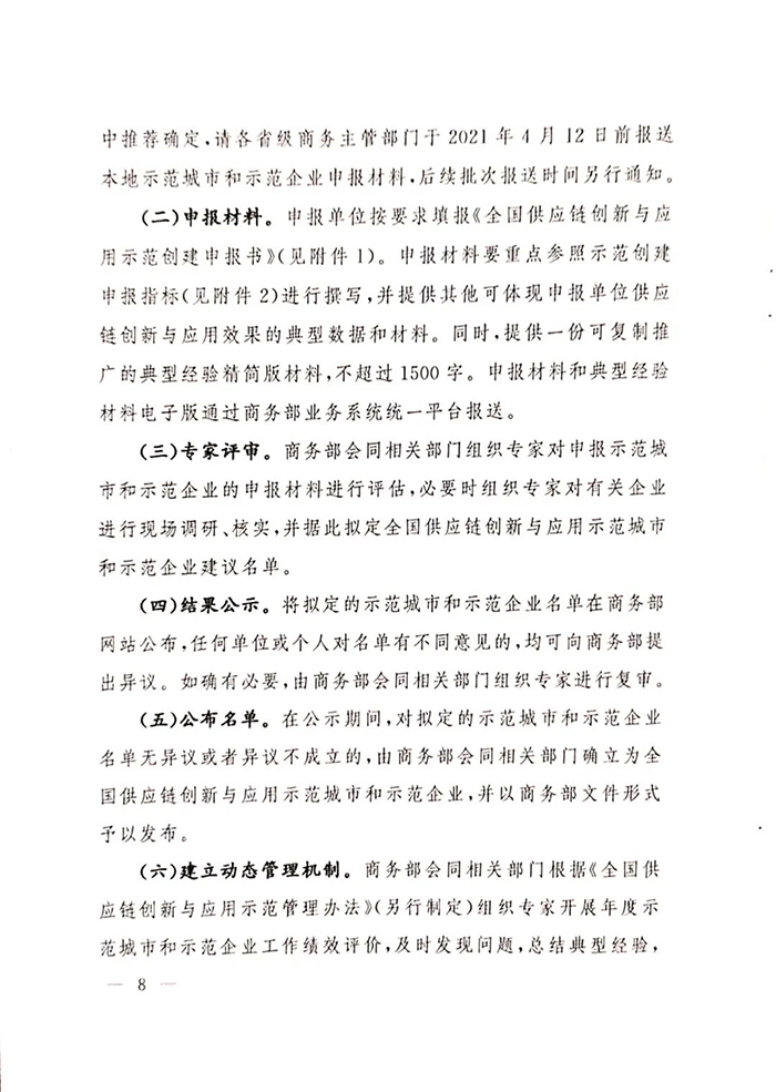 (注:2021年3月30日,商务部、工业和信息化部、中国物流与采购联合会印发《商务部等8单位关于开展全国供应链创新与应用示范创建工作的通知》)