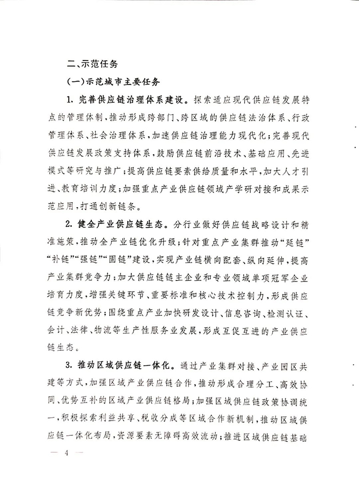 有关省级商务主管部门要会同相关单位,积极指导督促本地示范城市和示范企业扎实推进示范创建工作,充分发挥示范引领作用。示范城市要进一步完善供应链治理体系建设,出台支持供应链创新与应用的政策措施,营造良好外部环境,结合本地产业特色和发展实际,建立健全各环节、各要素高效协同的产业链供应链生态,提高供应链安全稳定和自主可控水平,助力经济转型和高质量发展;示范企业要进一步提高供应链管理水平,加快供应链数字化智能化升级,加强自主创新和技术攻关,建设上下游互联互通、资源整合能力强的供应链协同平台,形成大中小企业专业化分工协作的网络体系,全面提升企业供应链数字化、智能化、协同化、绿色化和国际化水平。