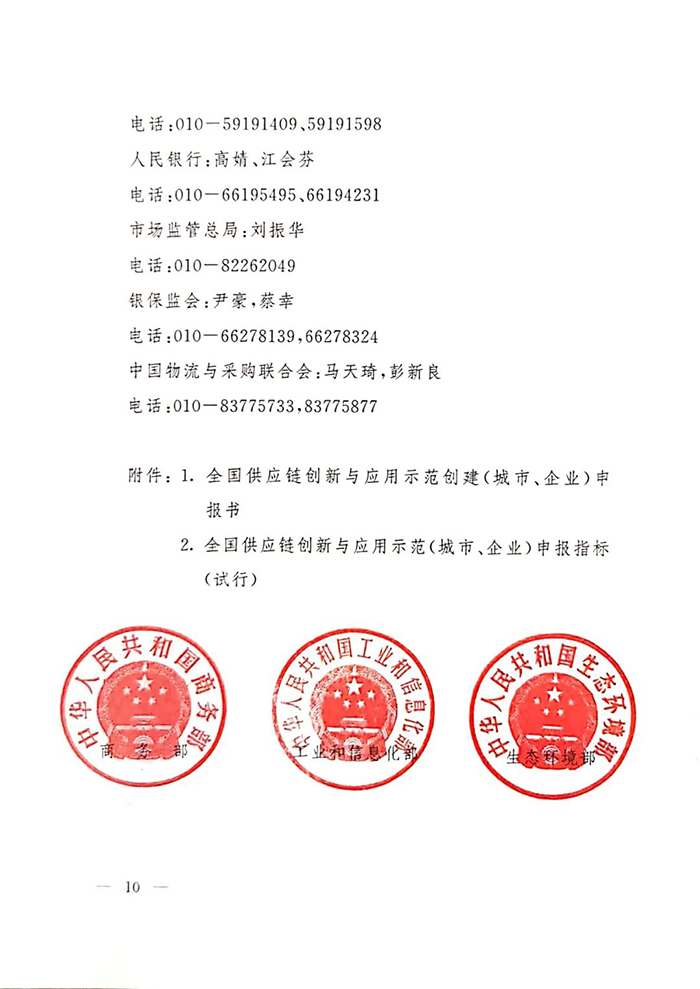 2021年7月12日,商务部、工业和信息化部、生态环境部、农业农村部、人民银行、市场监管总局、银保监会、中国物流与采购联合会等8单位联合印发通知,公布首批全国供应链创新与应用10个示范城市和94家示范企业。