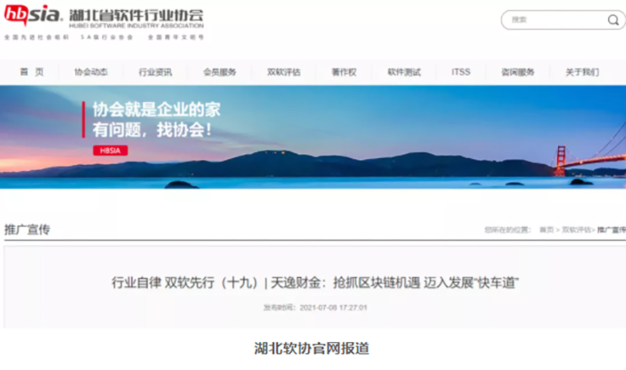 近期,湖北省软件行业协会(以下简称“湖北软协”)开展“行业自律,双软先行”双软示范企业系列报道。7月8日,湖北软协在其官方网站和微信公众号同步报道《天逸财金:抢抓区块链机遇 迈入发展“快车道”》。