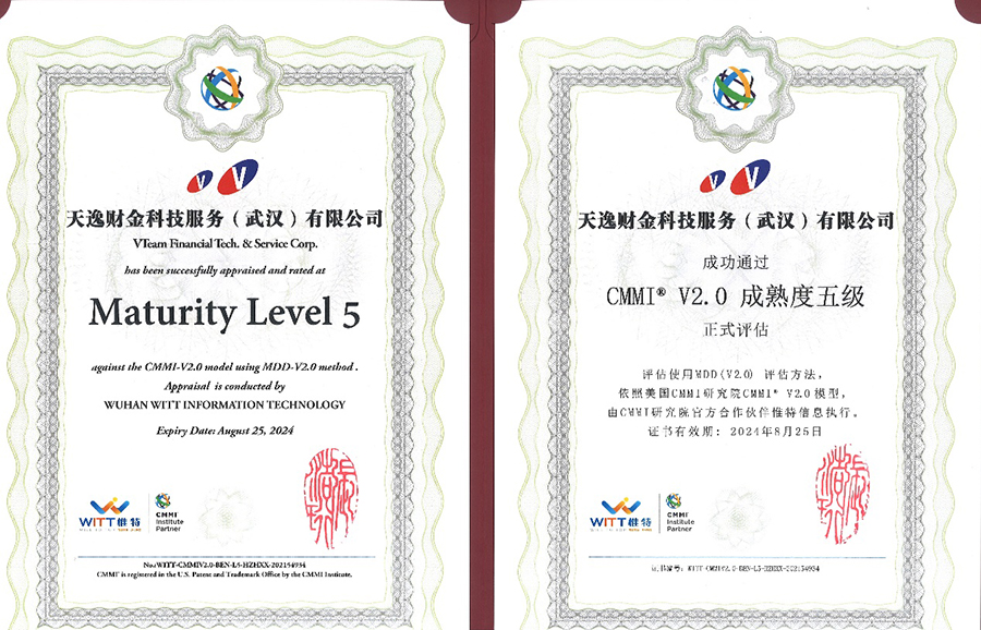 2021年8月,美国 CMMI(Capability Maturity Model Integration)研究院正式向天逸集团颁发了 CMMI5 级评估证书。CMMI 是由美国卡内基梅隆大学的软件工程研究所(SEI)制定的一套评估认证体系,代表着国际上最先进的软件工程方法,是目前世界公认的软件产品进入国际市场的通行证,也是全球软件界规格最高、难度最大的认证之一。能否通过 CMMI 认证已经成为业内衡量软件企业工程开发能力的重要标志之一。