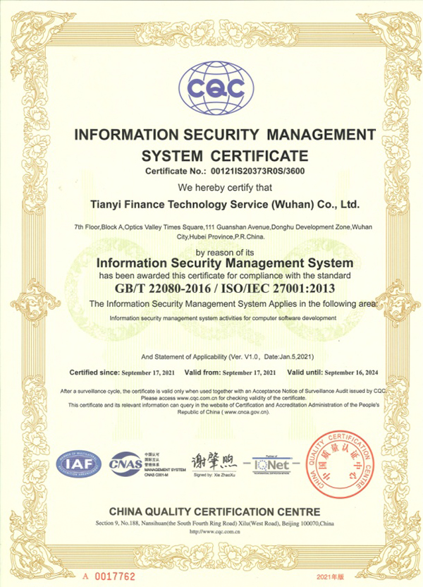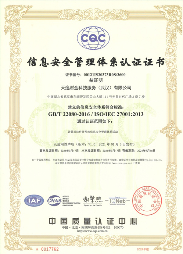 2021年9月,天逸金融服务集团(以下简称“天逸集团”)顺利通过信息安全管理的认证评定,取得GB/T 22080-2016/ISO/IEC 27001:2013信息安全管理体系认证证书。天逸集团所提供的计算机软件开发相关的信息安全管理符合全球信息安全的权威认证,这充分证明了天逸集团在信息资产的安全性、保障业务持续性等方面,已与国际标准水平全面接轨。