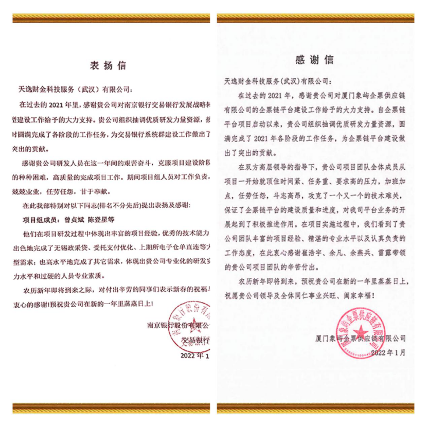 2月,天逸集团收到来自浦发银行、南京银行、象屿集团的感谢信,对天逸一年来与合作伙伴共克时艰、高效保供表示感谢。
