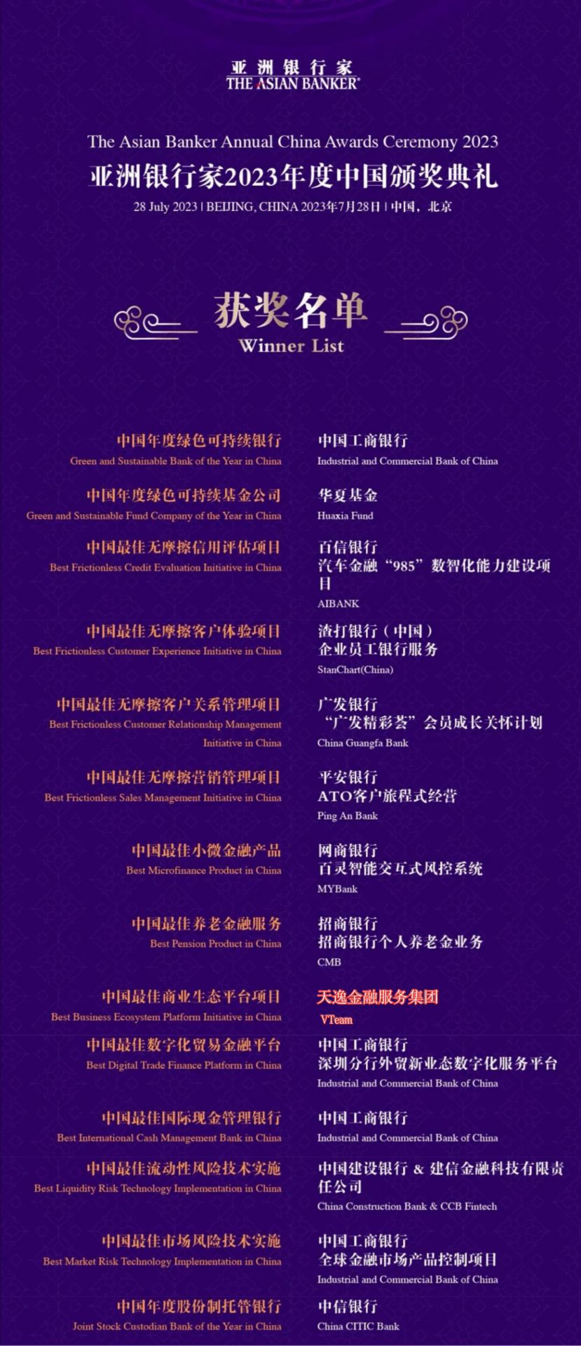 7月28日,由《亚洲银行家》主办的“2023中国未来金融峰会”于北京隆重举行。当晚,亚洲银行家正式公布2023年度中国奖项计划获奖名单。